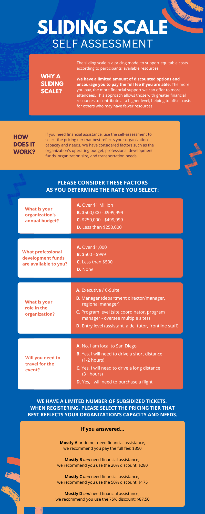 We are committed to living our values and creating access and opportunity. Our goal is to ensure that cost is not a barrier to participation. To increase equity and access, we are introducing sliding-scale pricing in 2025.