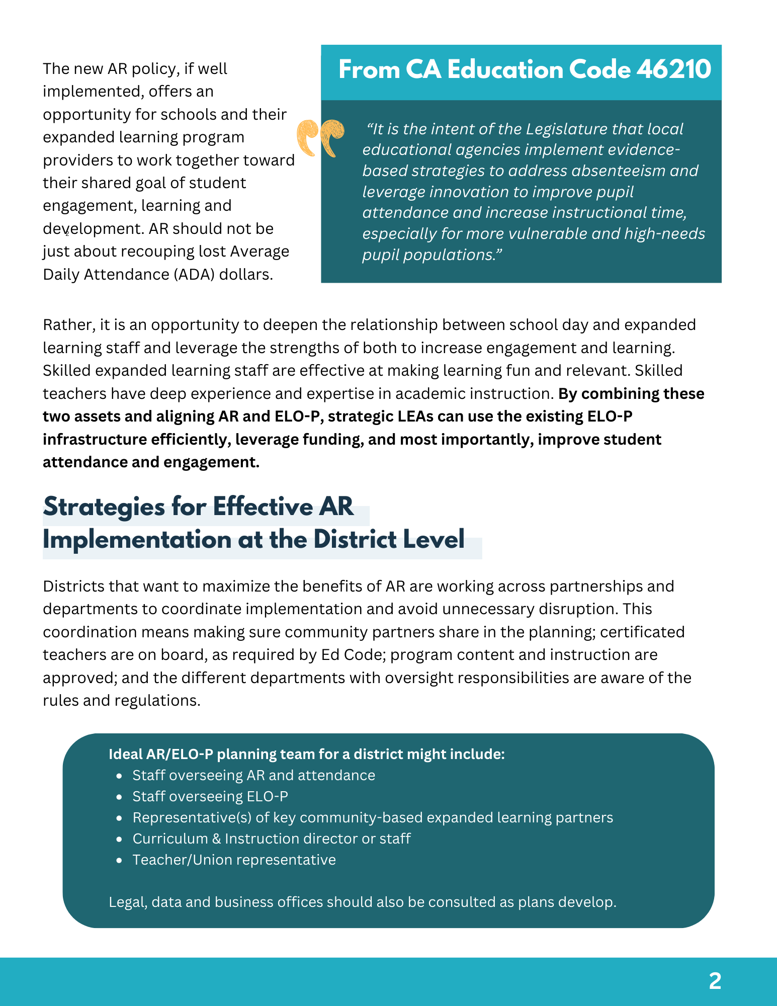 School districts across the state are planning to implement a new California Attendance Recovery policy that allows LEAs to recuperate lost ADA funding and learning by providing additional academic support to students outside of school hours. These recommendations advise LEAs on how to leverage their existing expanded learning infrastructure to maximize student learning, engagement, and attendance in school.