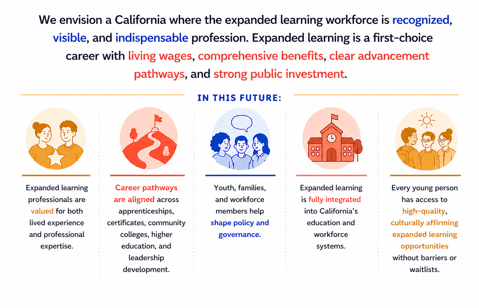 This roadmap envisions a future where California’s expanded learning workforce is valued, supported, and able to thrive. It is grounded in a simple belief: building a stronger future for young people and communities requires a stronger, more just, and more sustainable future for the workforce.