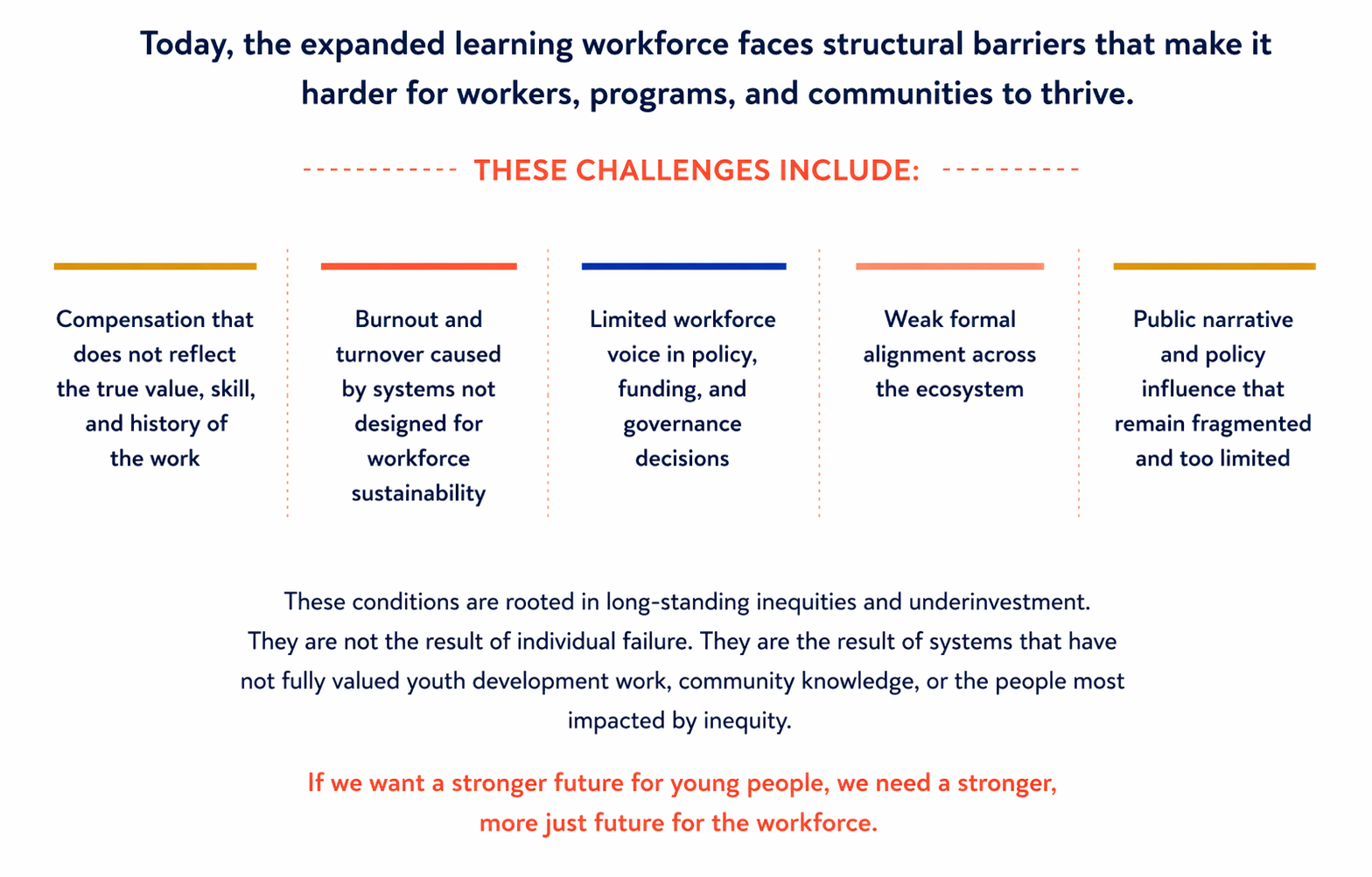 California’s expanded learning workforce is essential to young people, families, and thriving communities. Every day, youth development professionals nurture belonging, learning, leadership, and well-being. Yet too often, the people who make this work possible are asked to do so without the compensation, career pathways, support, and recognition they deserve.
